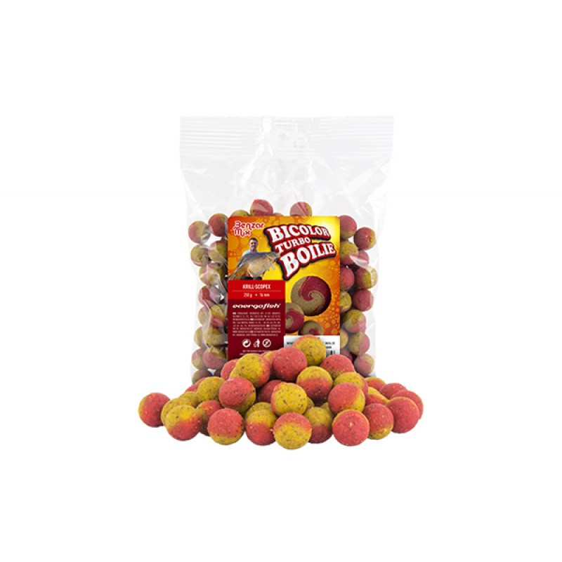 Turbo Bicolor Boilie Benzar vin într-o varietate mare de arome, se găsesc in 2 marimi de 16mm și 20mm, ambalate la pungă de 250gr.