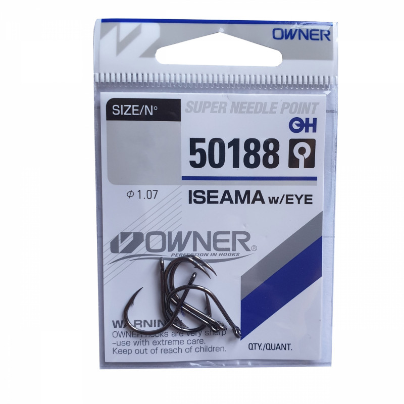 Carligele Owner din gama 50188 Iseama With Eye sunt caracterizate prin inelul de legatura si tija forjata care le face mai puternice, au tija medie spre scurta si varful de intepare mai alungit cu contra . Forma rotunda si culoare neagra crom il recomanda pescarilor de stationar ce folosesc drept momeala peletele, boilesurile, porumb, mamaliga, etc . Este unul dintre cele mai utilizate carlige de pescarii de crap.