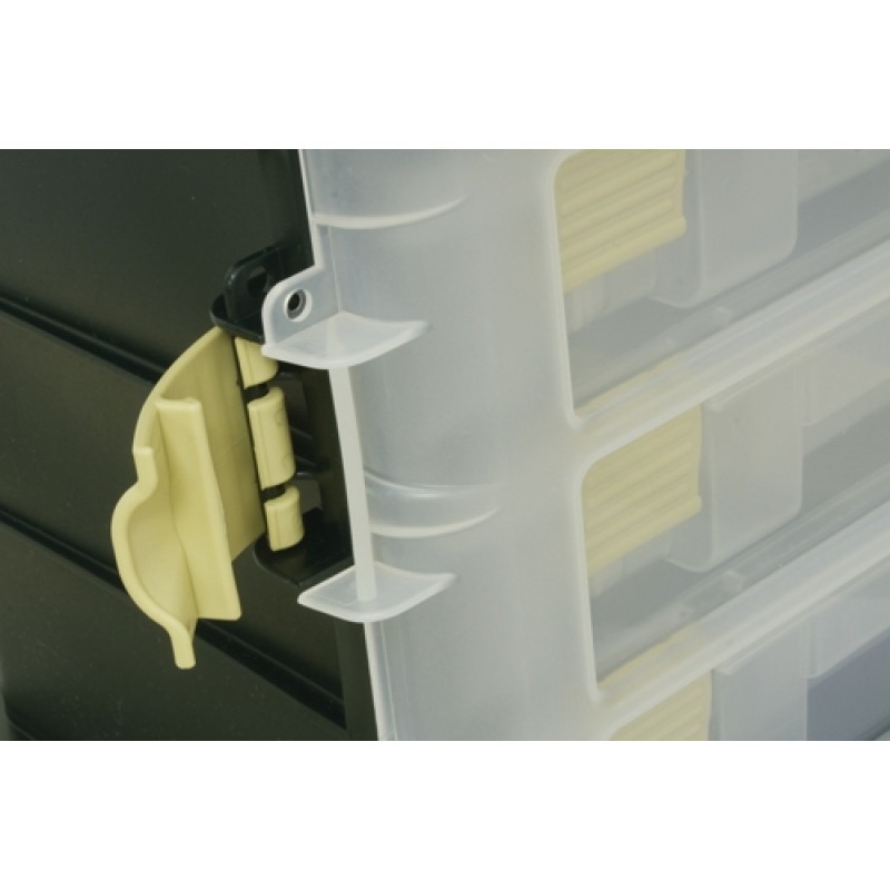 Dimensiunile cutiilor culisante sunt: lungime 28 cm, lăţime 18 cm, înălţime 5,5 cm. Cutiile culisante sunt transparente şi pot fi compartimentate – putem avea până la 13 compartimente în fiecare cutie!, în funcţie de articolele pe care dorim să le stocăm, cu ajutorul unor separatoare mobile. Aici pot fi păstrate accesorii de dimensiuni mai mici ca de exemplu năluci, plumbi, plute, etc.